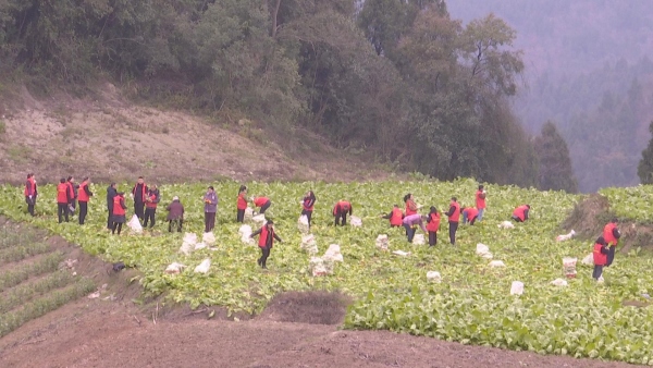 曹道權是涪陵區荔枝街道金竺村青菜頭種植大戶,家庭人口3人,孩子還在校讀書,今年共栽植青菜頭10余畝。前不久,曹道權農事勞作不慎被摔傷,走路都一瘸一拐的。春節前夕,金竺村駐村工作隊第一書記李杰在例行入戶走訪時,了解到曹道權的家庭情況后,及時向涪陵區總工會幫扶集團進行匯報。2月11日上午9時許,涪陵區總工會幫扶集團組織成員單位、荔枝街道辦事處、荔枝商會的80余名志愿者來到他家的菜地里,幫助他家收砍青菜頭。
