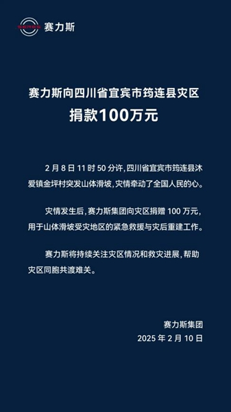 人民網重慶2月12日電 (記者胡虹)2月10日,賽力斯集團宣布向四川宜賓筠連縣災區捐贈100萬元,用于災區的緊急救援行動及后續的災后重建工作。