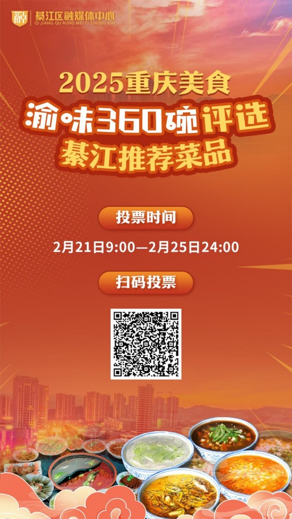 2月21日至2月25日,2025年“渝味360碗”綦江區菜品評選投票通道正式開啟,市民朋友們可通過“到綦江”APP和“綦江發布”微信公眾號投票評選出心儀美食。