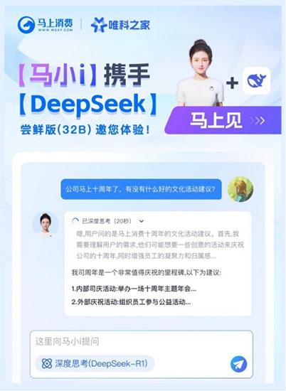 近日,馬上消費以人工智能技術為驅動,將數字人馬小i正式接入DeepSeek,打造“DeepSeek+數字化辦公”的智能平臺,構建具備深度思考能力、“7×24小時”數字化辦公體系,在推進公司全面AI化戰略落地方面進入新階段。