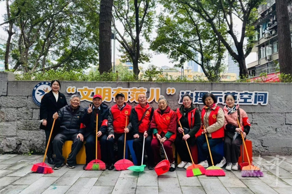 由居民組成的志愿管理隊伍在“文明有范兒”治理示范空間留影。渝中區委宣傳部供圖