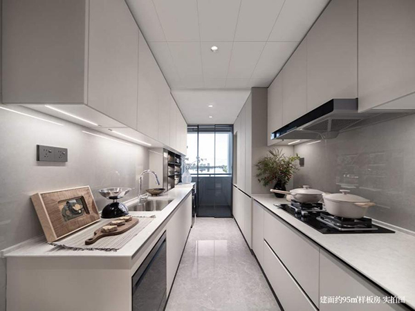 以生活空間為中心,約95㎡戶型打造約35㎡闊綽寬廳,開間約4.2米,廚房空間約12㎡,連接約6平超大靈動家政區,以獨立的晾曬空間釋放景觀陽臺空間,讓四代宅露臺生活充分發揮。