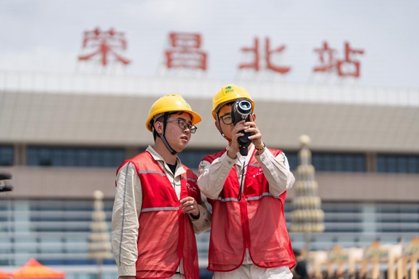 國網重慶永川供電公司員工在榮昌高鐵站外開展線路紅外測溫。國網重慶永川供電公司供圖