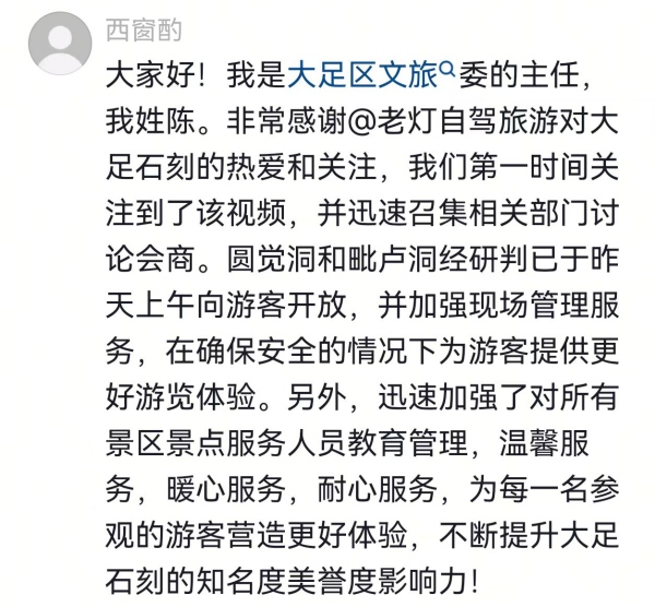 翻開評論區,網友“西窗酌”發布的一條評論,讓人暖心不已,圈粉無數:大家好!我是大足區文旅委的主任,我姓陳。非常感謝@老燈自駕旅游對大足石刻的熱愛和關注,我們第一時間關注到了該視頻,并迅速召集相關部門討論會商。圓覺洞和毗盧洞經研判已于昨天上午向游客開放,并加強現場管理服務,在確保安全的情況下為游客提供更好游覽體驗。另外,迅速加強了對所有景區景點服務人員教育管理,溫馨服務,暖心服務,耐心服務,為每一名參觀的游客營造更好體驗,不斷提升大足石刻的知名度美譽度影響力!