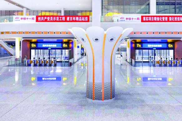 進入候車大廳,一個黃紅相間的藝術樓梯盤旋而上?!斑@不僅是通道,更是國內高鐵站首創的‘1.0城市步道交通mini圖書館’?!敝需F十一局重慶東站項目總工程師周海彬介紹,該區域將傳統的樓梯空間升級為集通行、休閑、閱讀于一體的多功能區域。精心布置了綠意盎然的花池、舒適的休憩座椅,以及充滿文藝氣息的圖書漂流書柜。旅客們可以在此小憩片刻,隨手取閱書籍,讓候車時光變成一段愜意的閱讀體驗。