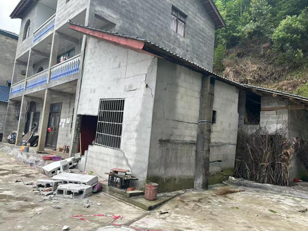 10日10時30分許,該滑坡持續變形,滑坡后緣變形明顯加劇,吳明國家房屋墻壁和地壩出現多處拉張裂縫,裂口最寬達到20厘米,位置下錯達到20厘米,造成1間房屋局部垮塌。因提前撤離人員,未造成傷亡。
