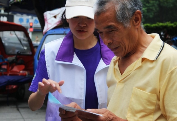 實踐團成員向居民宣傳豐都瓢畫故事。李春柳攝