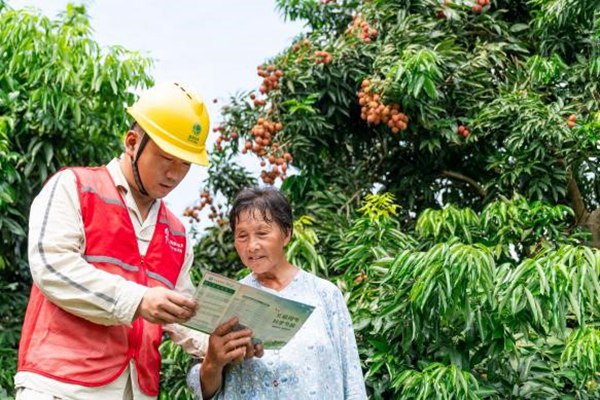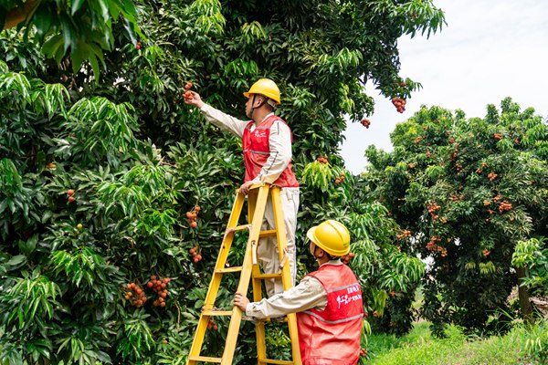 近日,永川區朱沱鎮漲谷村荔枝產業園,國家電網重慶電力(永川)紅巖共產黨員服務隊背著工具包穿梭在荔枝林間。
