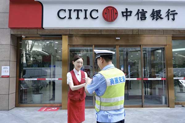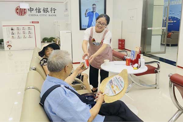 中信銀行重慶觀音橋支行將關懷延伸至城市守護者與戶外勞動者。在支行附近的熱門商圈,工作人員為烈日下堅守崗位的輔警、忙碌奔波的外賣騎手送去礦泉水。同時,在廳堂打造“愛心休息驛站”,敞開大門歡迎商圈內想要休息的市民和烈日下的工作者進來納涼、飲水、稍作休息。工作人員還為他們送上金融安全知識宣貫,讓大家在享受清涼的同時,增強金融風險防范意識。