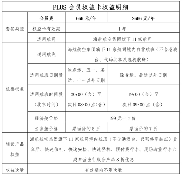 “海航PLUS會員權益卡”提供666元和2666元兩檔選擇,旅客可結合自身出行需求選擇。產品適用于海航航空集團旗下海南航空、首都航空、天津航空、祥鵬航空、西部航空、北部灣航空、福州航空、烏魯木齊航空、長安航空、金鵬航空、大新華航空11家客運航司的早晚時段自營國內航線任意航班。