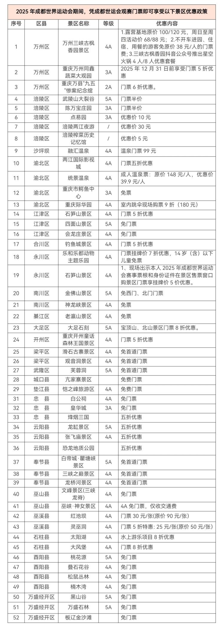 據了解,2025年成都世運會期間,重慶52家旅游景區針對世運會觀賽游客推出免門票、五折優惠等重磅景區優惠政策(詳見附表),包括5A級景區10家、4A級景區29家、3A級景區5家,凡持有2025年成都世運會賽事門票的觀眾,憑票根可享受景區門票特惠(每張票根限享1次優惠)。