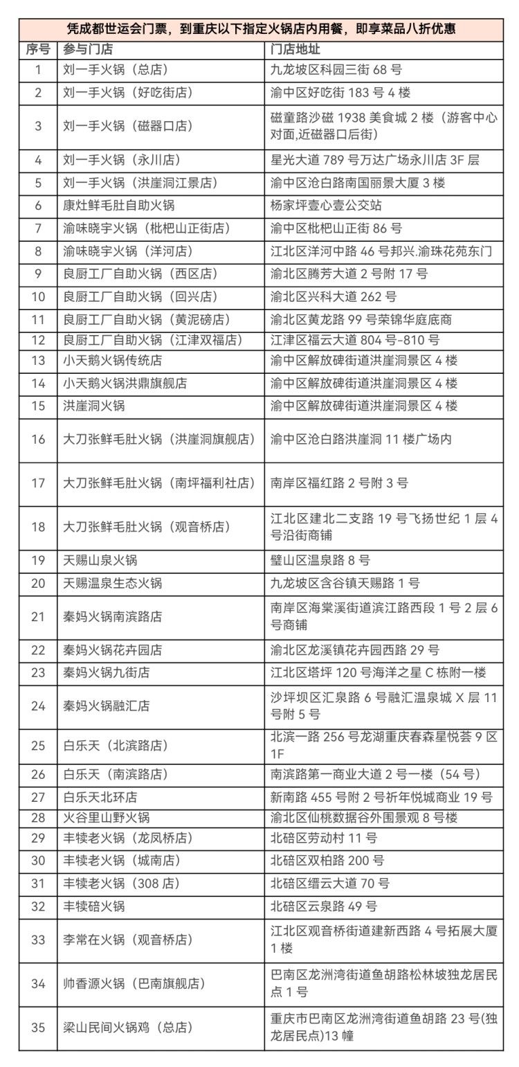 為了讓全球市民游客感受重慶麻辣與熱情,即日起至9月底,2025不夜重慶生活節期間,劉一手、渝味曉宇火鍋、小天鵝等近15家重慶知名火鍋品牌、近40家火鍋門店以8折優惠接待觀賽游客。