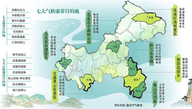 七大避暑目的地為武隆仙女山、豐都南天湖、奉節興隆鎮、涪陵武陵山、石柱黃水、酉陽菖蒲蓋、江津四面山。這些地方海拔均在1000米以上,夏季最高氣溫均在20℃左右,適于避暑。