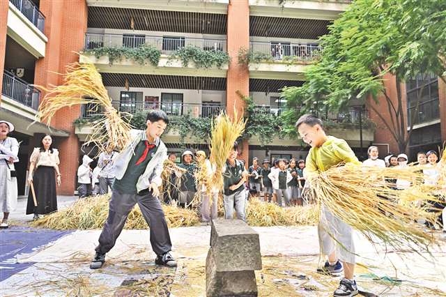 學校還準備了傳統風車、簸箕、石墩等,將空地變成了打谷場。孩子們握緊稻子高高舉過頭頂,再使勁往石墩上摔打,“砰砰”聲響起,金黃的谷粒不停滾落。