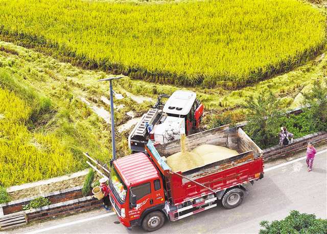 初秋時節,梁平區蟠龍鎮扈槽村的高山優質水稻喜獲豐收,當地農民趁著晴好天氣加緊搶收,力爭顆粒歸倉。