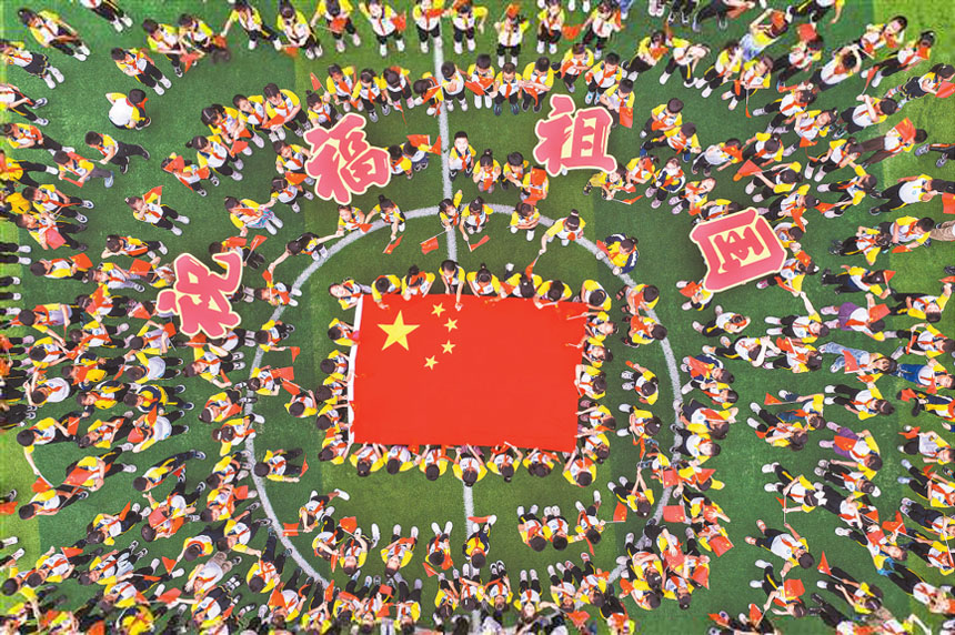 9月29日,北碚區勉仁小學,孩子們聚在一起和國旗合影。