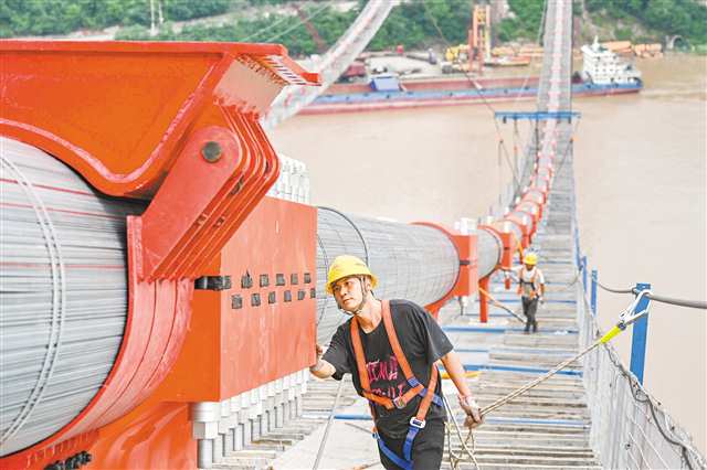10月4日,黃桷沱長江大橋施工現場,工人正在對主纜、索夾進行檢查。