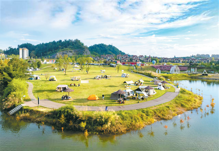 秋日的黎香湖鎮濕地生態園,露營區大片的綠色草坪上,各式帳篷星羅棋布,游客們在此享受大自然的寧靜與愜意。