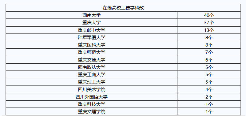 在中國頂尖學科數量上,在渝高校有3個學科(西南政法大學法學、重慶大學土木工程、四川美術學院美術與書法)上榜。此外,在渝高校擁有27個中國一流學科。(新重慶-重慶日報記者 李志峰)