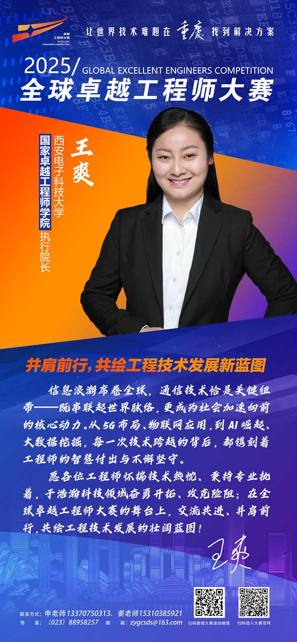 10月15日,西安電子科技大學國家卓越工程師學院執行院長王爽向全球卓越工程師大賽·2025年度發來推介詞:信息浪潮席卷全球,通信技術恰是關鍵紐帶——既串聯起世界脈絡,更成為社會加速向前的核心動力。從5G布局、物聯網應用,到AI崛起、大數據挖掘,每一次技術跨越的背后,都鐫刻著工程師的智慧付出與不懈堅守。愿各位工程師懷揣技術熱忱、秉持專業執著,于浩瀚科技領域奮勇開拓、攻克險阻;在全球卓越工程師大賽的舞臺上,以交流促共進、以并肩赴新程,共繪工程技術發展的壯闊藍圖!