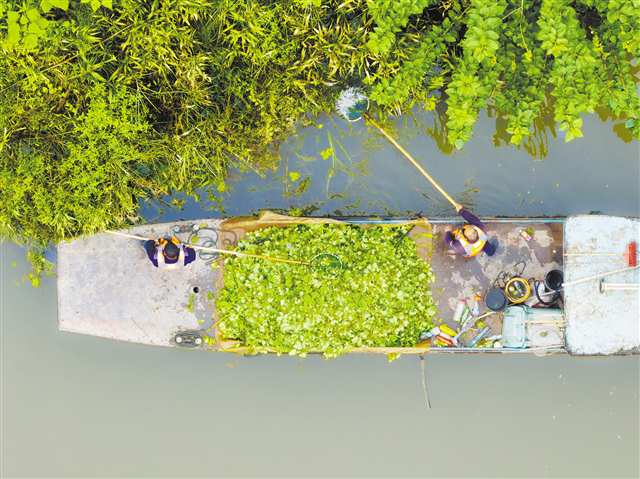 10月27日,合川區小安溪臨渡斷面,環衛工人在清理浮萍。