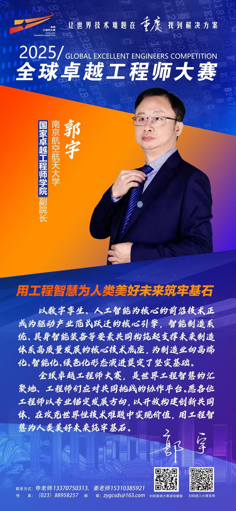 11月4日,南京航空航天大學國家卓越工程師學院副院長郭宇向全球卓越工程師大賽·2025年度發來推介詞:以數字孿生、人工智能為核心的前沿技術正成為驅動產業范式躍遷的核心引擎,智能制造系統、具身智能裝備等要素共同構筑起支撐未來制造體系高質量發展的核心技術底座,為制造業向高端化、智能化、綠色化形態演進奠定了堅實基礎。全球卓越工程師大賽,是世界工程智慧的匯聚地、工程師們應對共同挑戰的協作平臺。愿各位工程師以專業錨定發展方向,以開放構建創新共同體,在攻克世界性技術難題中實現價值,用工程智慧為人類美好未來筑牢基石。