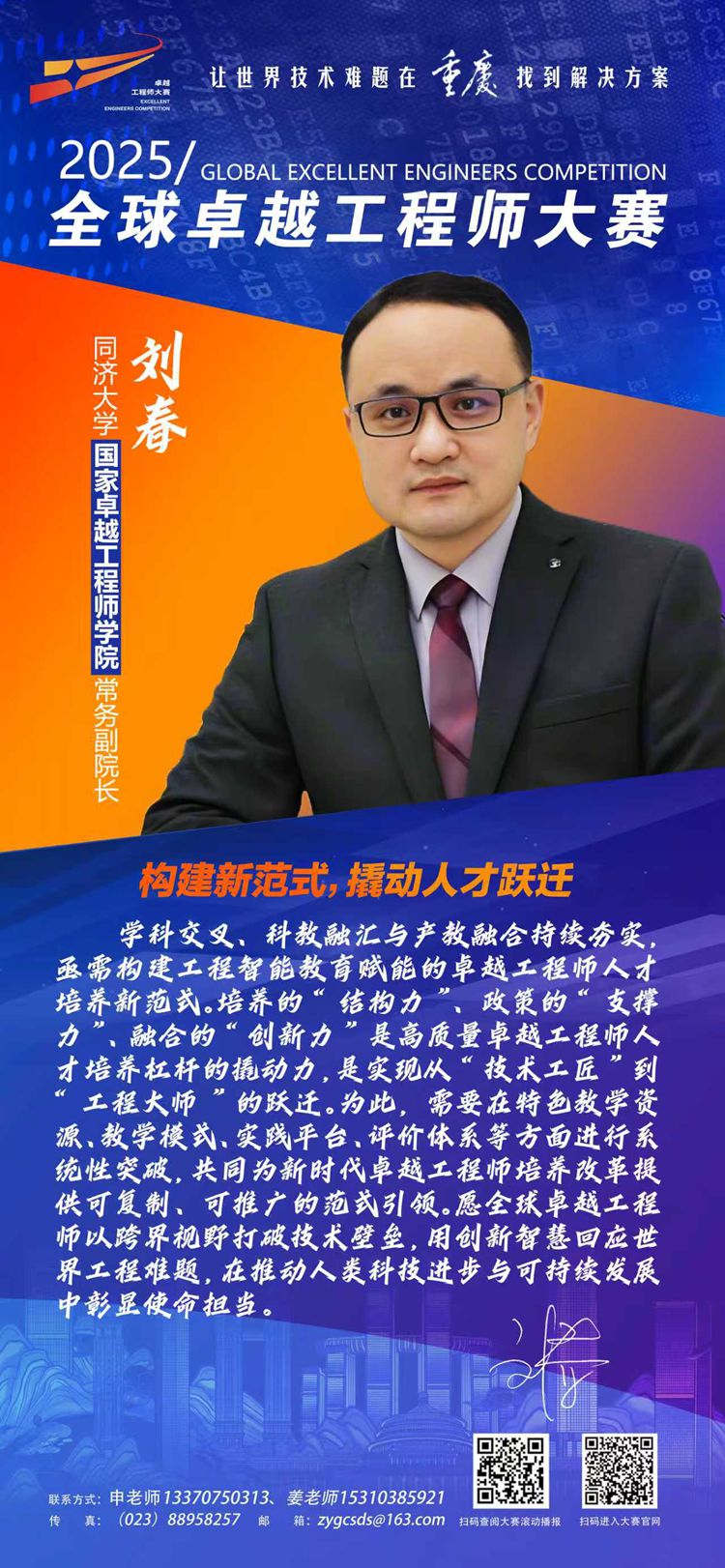 11月4日,同濟大學國家卓越工程師學院常務副院長劉春向全球卓越工程師大賽·2025年度發來推介詞:學科交叉、科教融匯與產教融合持續夯實,亟需構建工程智能教育賦能的卓越工程師人才培養新范式。培養的“結構力”、政策的“支撐力”、融合的“創新力”是高質量卓越工程師人才培養杠桿的撬動力,是實現從“技術工匠”到“工程大師”的躍遷。為此,需要在特色教學資源、教學模式、實踐平臺、評價體系等方面進行系統性突破,共同為新時代卓越工程師培養改革提供可復制、可推廣的范式引領。愿全球卓越工程師以跨界視野打破技術壁壘,用創新智慧回應世界工程難題,在推動人類科技進步與可持續發展中彰顯使命擔當。