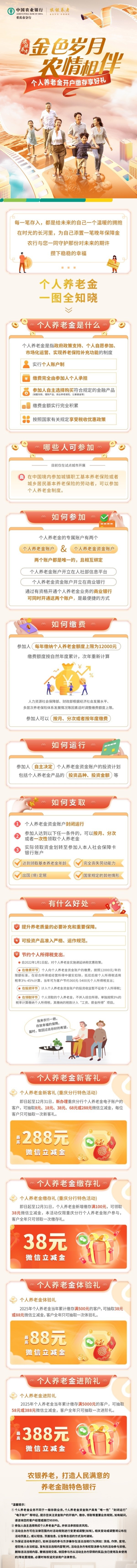怎么開啟自己的個人養老金賬戶?每年又能為未來的自己存下多少保障?作為我國養老保險體系關鍵的“第三支柱”,個人養老金制度已正式實施——這是一項政策支持、個人自愿參與的補充養老計劃,可通過商業銀行便捷開戶,每年最高繳存12000元并享受稅收優惠,助力規劃更安穩的晚年。怎么參加?具體有哪些優惠?一起來看長圖。(農行重慶市分行)